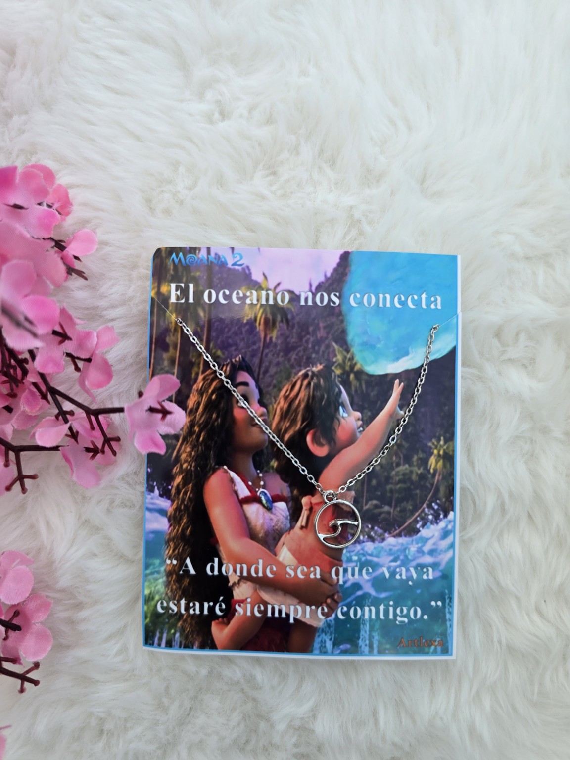 Este collar simboliza unión, protección y amor incondicional. Inspirado en Moana, su colgante en forma de ola representa fuerza, conexión y guía interior.